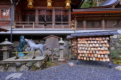 御祭神は、水を司る高龗神。平安時代に和泉式部が夫の心変わりに悩んで参拝し、復縁できたことから縁結びの神様としても知られています。雨乞いのときには黒馬を、雨止みのときには白馬を神様に奉納していましたが、時とともに馬の絵を描いた木板を奉納するように。境内には黒と白の神馬像があります。何事もうまくいく絵馬など、馬がモチーフの授与品もいっぱい。絵馬発祥の神社のひとつとして伝わります。