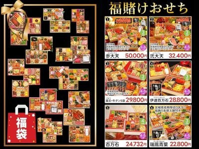 どれが届くかは運次第! 19,500円~5万円のおせち、全23種類。何が当たってもおトク間違いなしの人気商品♪ お値段はラッキーセブンの7,777円!