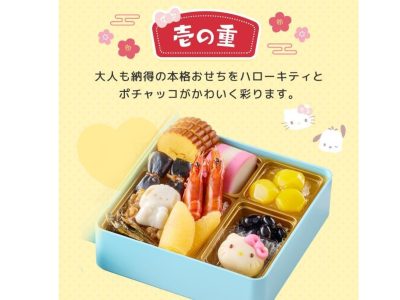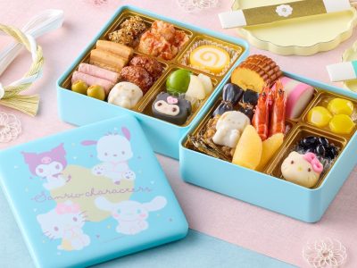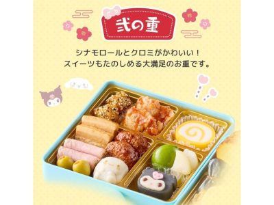 2026年「限定デザインの重箱」に入った、「サンリオ」キャラクターおせち。重箱はもちろん、入っているお料理もかわいい! 大人も納得の和洋2段重です