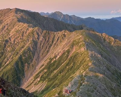 朝日に染まる、間ノ岳への3,000m級の”天空の稜線”。山小屋は北岳山荘。