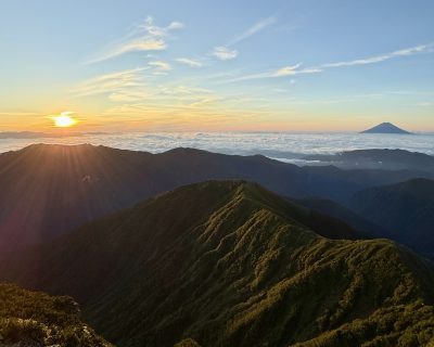 奥秩父の山の奥から現れたご来光と富士山