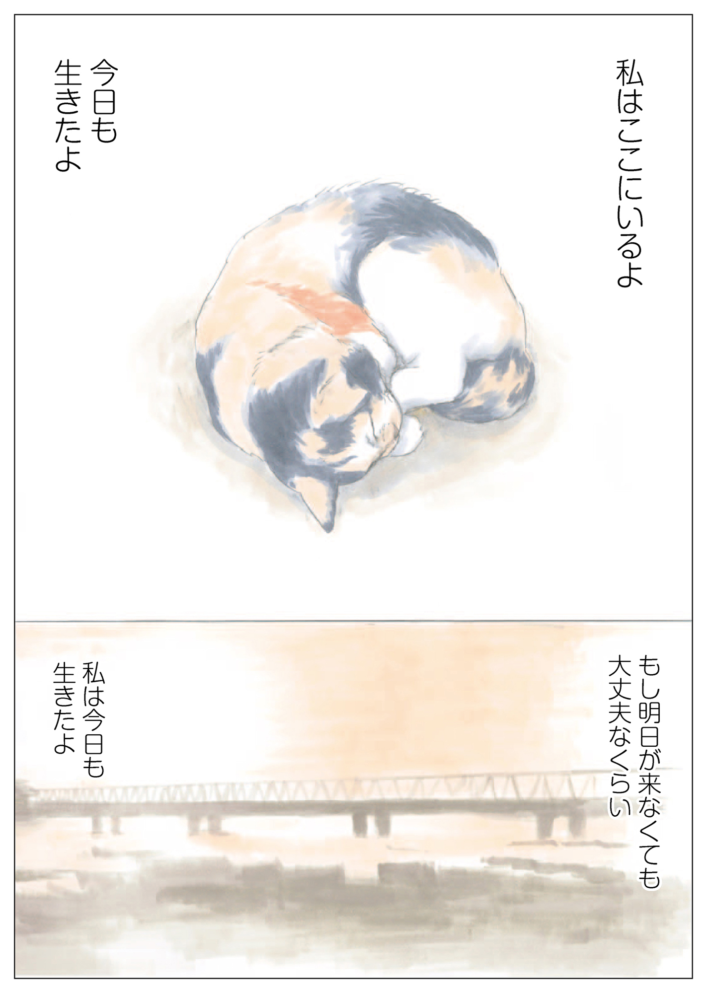 それからしばらくして、首輪をつけたきつねこちゃんがミケちゃんを訪ねて来ました。「ミケちゃん、私ご近所のおうちの子になったの。今日は挨拶に来たのよ」もう一緒には遊べない…。ちょっぴり切ないお別れではありましたが、危険で過酷なお外の生活にさよならできたことを思えばよかったのかもしれません。