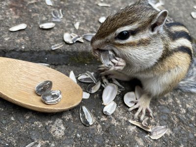 入園は無料ですが、リスさんたちのごはんであるひまわりの種は、有料。木のスプーンにひまわりをのせてじっと待っていれば、小さなシマリスさんがちょろちょろちょろっと走り寄ってきて、ポリポリポリと食べてくれるのです! その愛らしさはもうたまりません。小さなおててでひまわりの種をさっとつかみ、ポリポリと目の前で食べ始めてくれるのがもう最高!