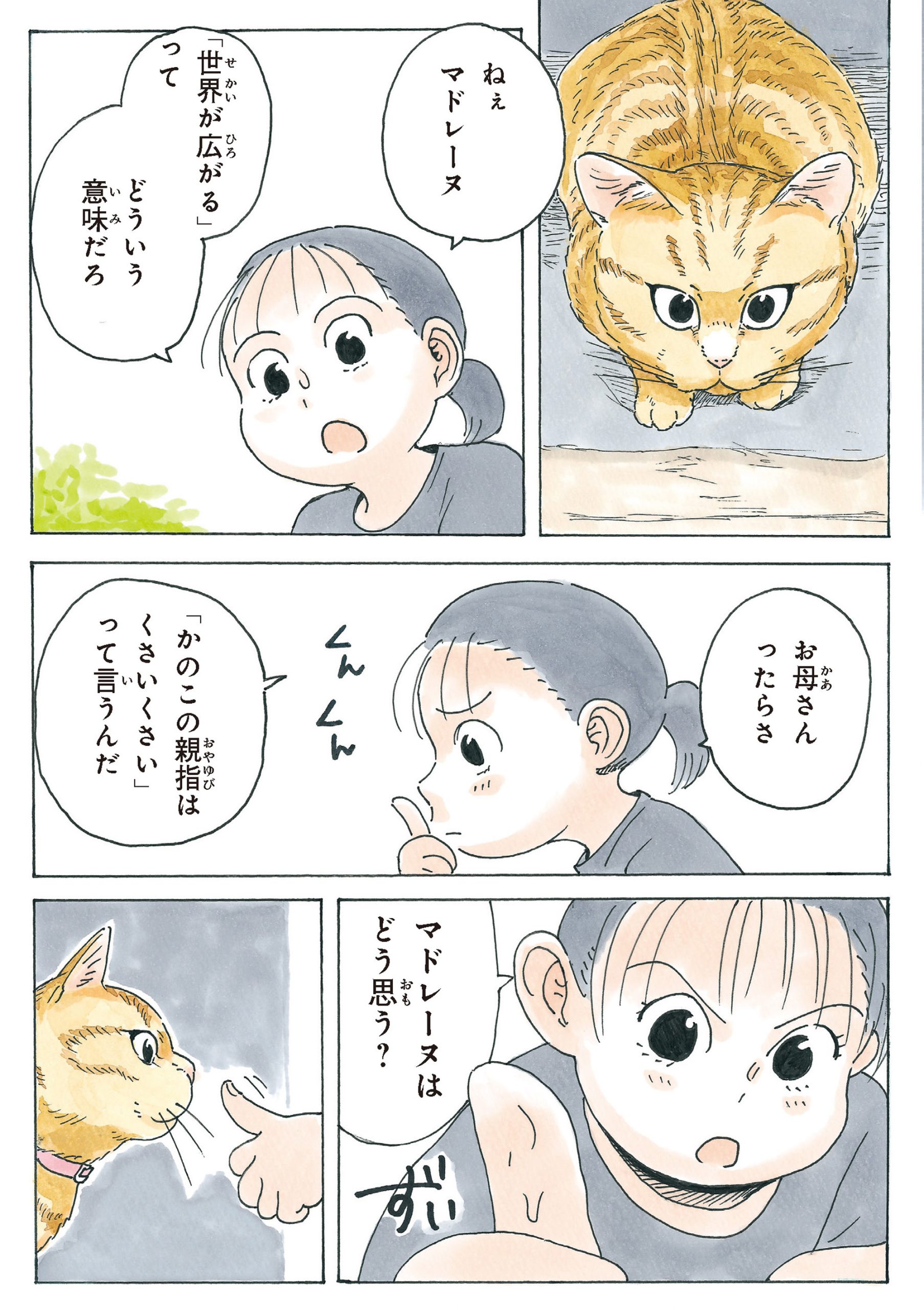 小学生になっても「指しゃぶり」がやめられない! 猫に指を噛まれてニオイを嗅ぐと? 【かのこちゃんとマドレーヌ夫人 #2】