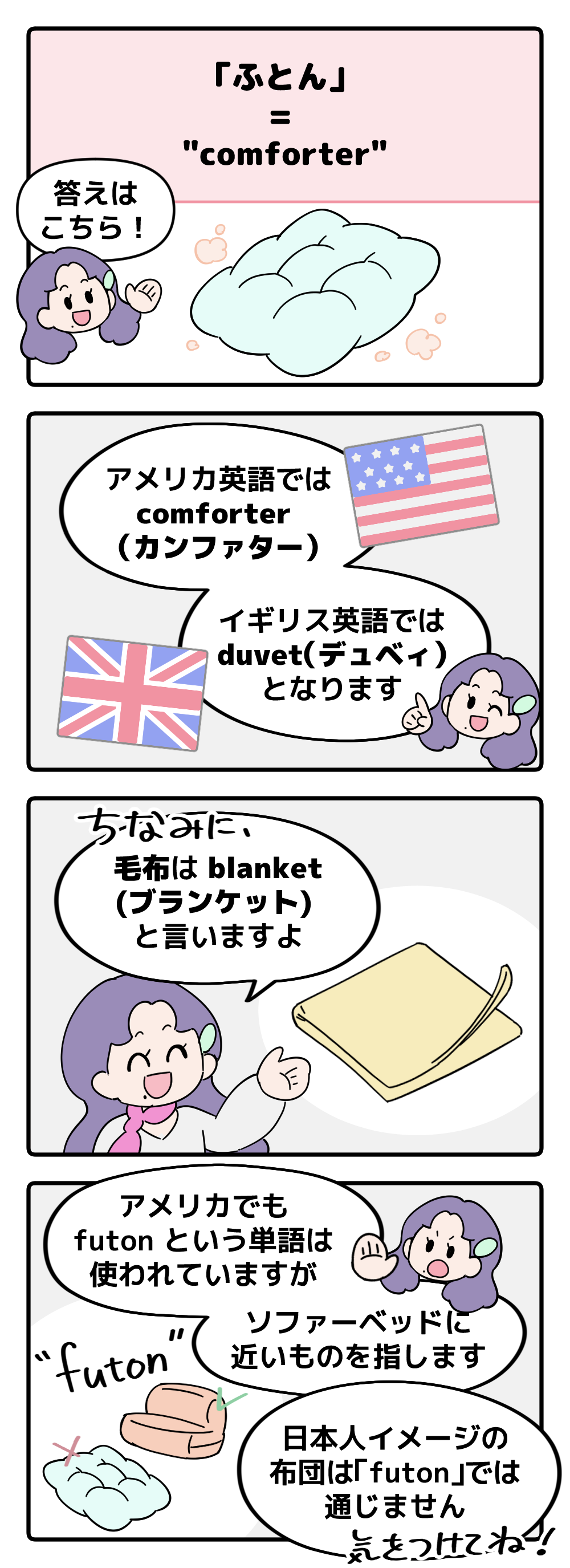 英語で「ふとん」は「FUTON」では通じません!ヒントは「C」から始まる…