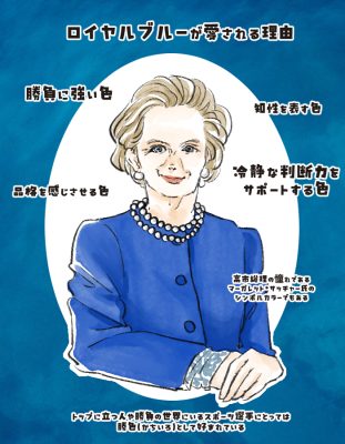 また、ロイヤルブルーは集中力と冷静さ、深い内省をもたらす色とされています。この色を身につけていると自然と冷静な判断力が養われるとともに、誠実さのある印象を与えるといわれているのです。そうした由来から、とかく女性政治家に好まれるカラーとしても有名です。