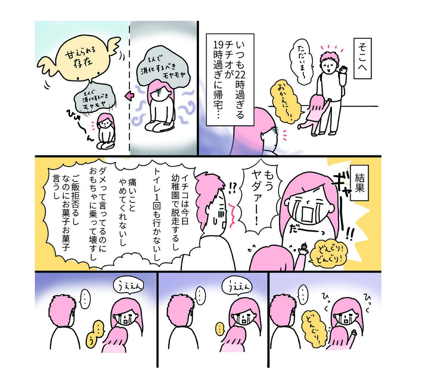娘へのモヤモヤが溜まってたところに夫帰宅。甘えられる存在の登場で思わず大爆発!!【育児ってこんなに笑えるんや! #40】
