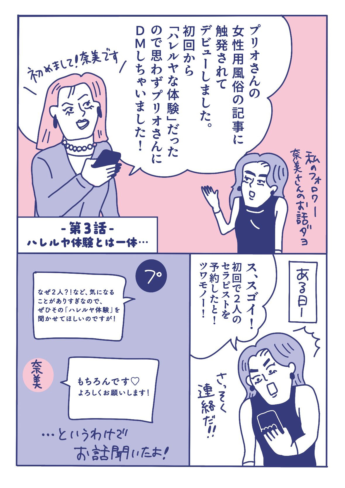 第3話ではプリオさんの体験談を読んで「女性用風俗に関心が湧いてデビューした!」というフォロワー奈美さんへインタビュー。夫さんとの性生活も大満足、仕事も順調。そんな奈美さんがなぜ女性用風俗へ????しかも初回からダブルセラピストって???みんなが気になるアレコレを根掘り葉掘り聞いちゃいました。