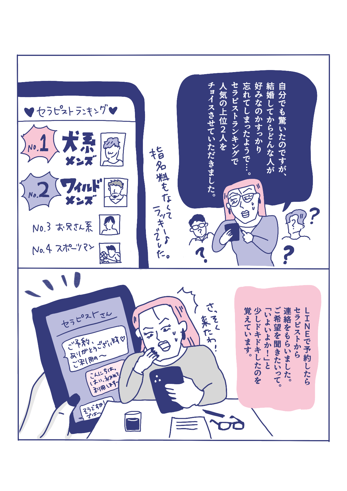 第3話ではプリオさんの体験談を読んで「女性用風俗に関心が湧いてデビューした!」というフォロワー奈美さんへインタビューを行いました。夫さんとの性生活も大満足、仕事も順調。そんな奈美さんがなぜ女性用風俗へ????しかも初回からダブルセラピストって???みんなが気になるアレコレを聞いちゃいました。