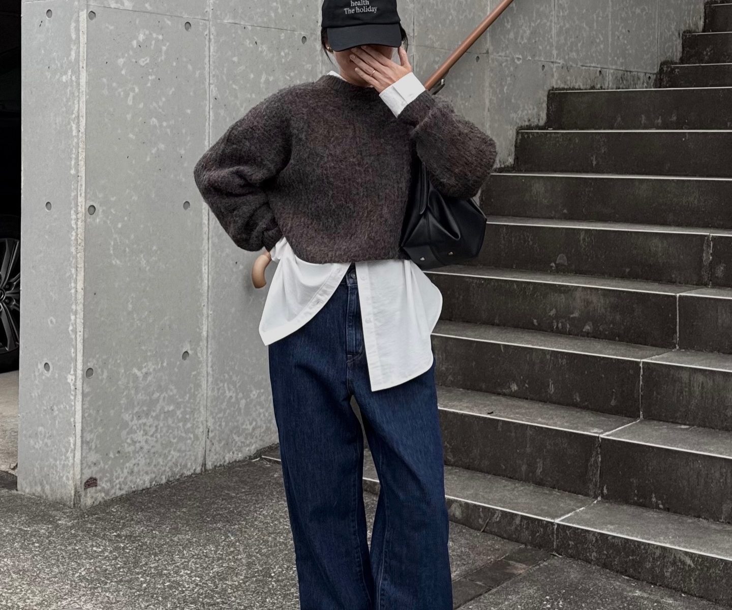 寒さが深まる季節にぴったりの、miki__uchikoshiさんによる洗練されたレイヤードスタイルです。主役はくたっとした質感が心地よいブラウンのショート丈ニット。そこに白シャツを裾から大胆にのぞかせることで、コーディネートに奥行きと清潔感が生まれます。レイヤードは単なる防寒だけでなく、手抜きに見えないこなれ感を演出してくれるのが嬉しいポイントです。
