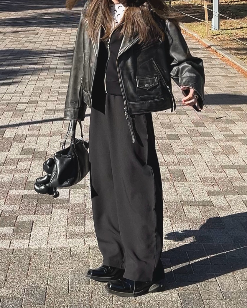 レザージャケットで魅せる冬の黒コーデ。ゆるっとしたカーブシルエットパンツ合わせがポイント【40代の毎日コーデ】