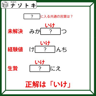 それは上図の通りでハテナの中には「いけ」が入ります。上から「みかいけつ(未解決)」「けいけんち(経験値)」「いけにえ(いけにえ)」となりますね。というわけで正解は「いけ」でした。