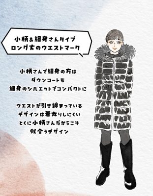 身長が155cm前後の小柄さんの場合、着丈の長いダウンコートは着膨れた印象を与えやすいです。しかし、ロング丈でも着膨れせずに着こなせるのが、細身シルエットでウエストにくびれがあるタイプ。あえて昨今、流行りのボリュームシルエットではなく、昔からあるこのタイプの定番シルエットを選ぶほうが、骨格的にはマッチしやすいですね。
