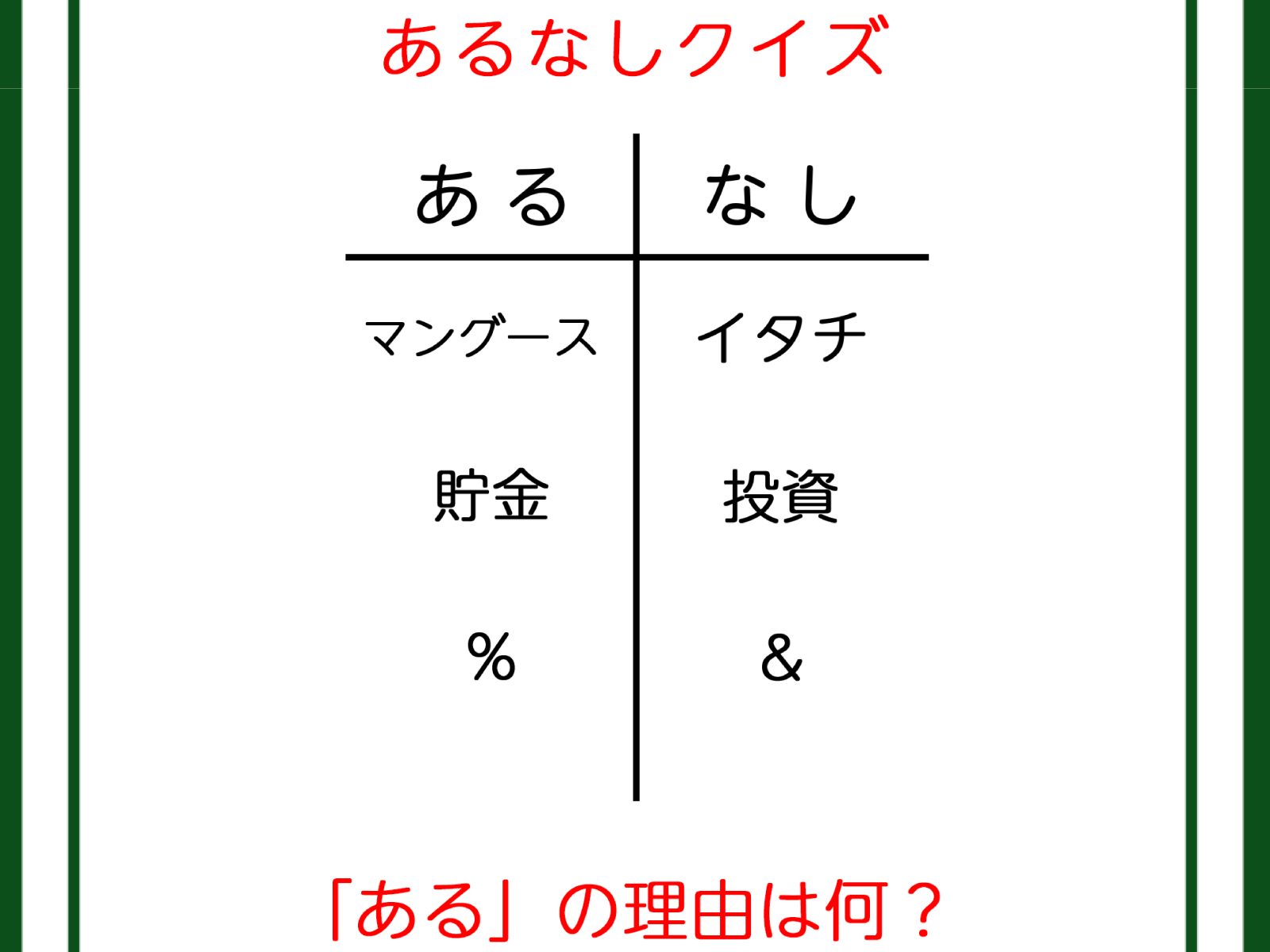 あるなしクイズです!「マングースにあってイタチない。貯金にあって投資にない」あるの理由はなーんだ?【難易度LV3.・中辛】