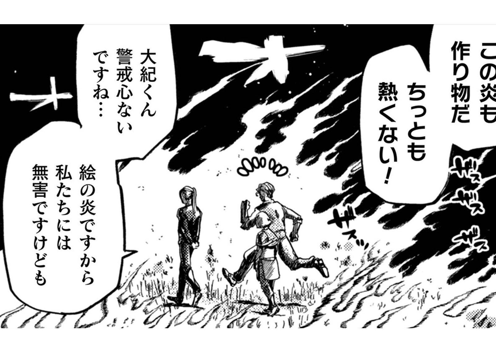 燃えだした草原を進む、ちぐはぐな一行。その頭上に現れた巨大生物とは…?【アウトリーチ #14】