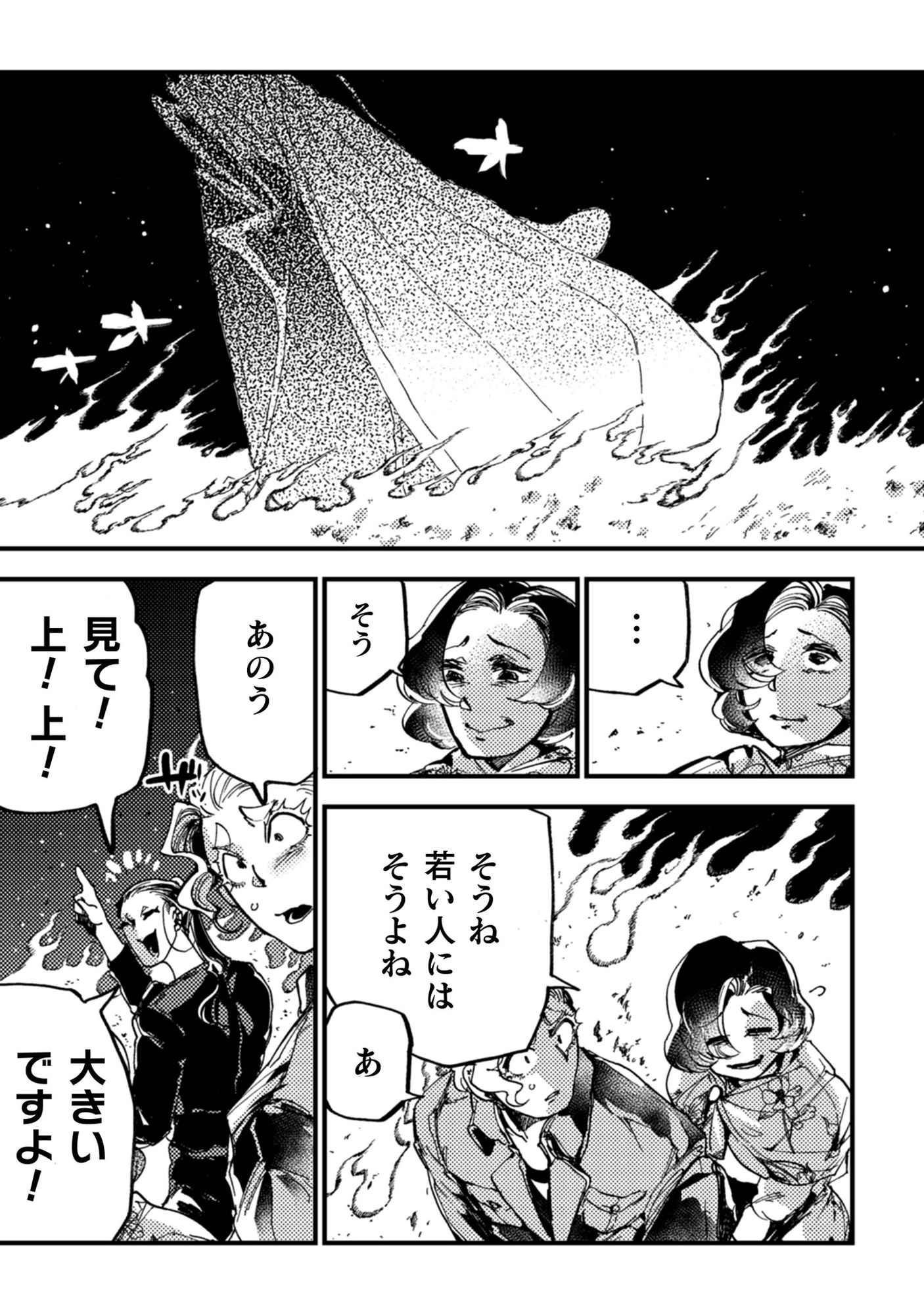 燃えだした草原を進む、ちぐはぐな一行。その頭上に現れた巨大生物とは…?【アウトリーチ #14】