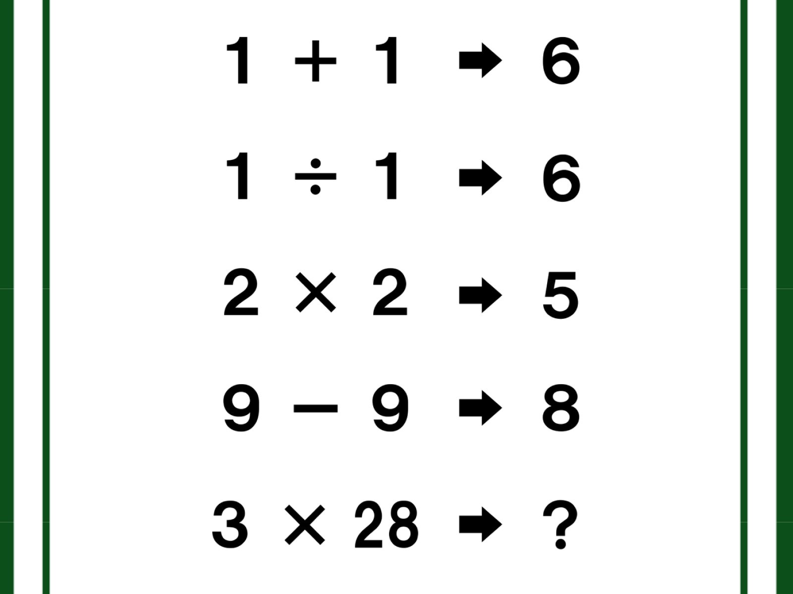 クイズです!「1+1→6、9-9→8」のとき、3×28はどうなる?【難易度LV4.・辛口】