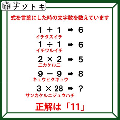 クイズです!「1+1→6、9-9→8」のとき、3×28はどうなる?【難易度LV4.・辛口】