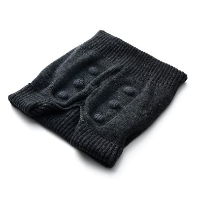 医療機器好きの筆者としては、体感を味わいながら説明書を読むのも楽しみのひとつ。ネックウォーマーはちょうど後頭部の下あたりに、おしゃれなボタンのような石が埋め込まれています。説明書を読むと、130ミリテスラのフェライト永久磁石6つを首・肩部分に縫い込んであり、コラントッテ独自のN極S極交互配列で配置された、直径18mmの大きめの磁石が装着部の血行を促進してくれるとのことですが……。