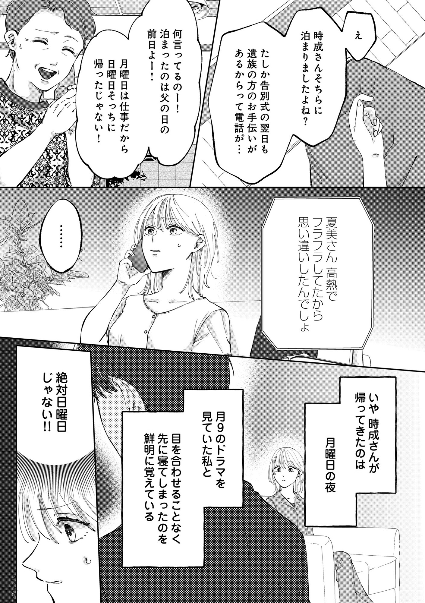 友人の葬儀の日、夫はどこに泊まったの?義母との会話で夫が嘘をついていたことを知り…【熱が冷めた私たちは #3】