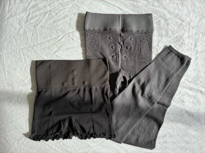 私の愛用アイテムのご紹介です。「着圧レギンス」(右)は腰の位置に6個の磁石を配置し、磁気の力を発揮。はくだけで腰まわりの血行を改善するそう。「オーバーパンツ」(左)は下腹部の5つのツボの位置周辺に磁石を配置。磁力が下腹部のツボに働きかけて血行を改善します。