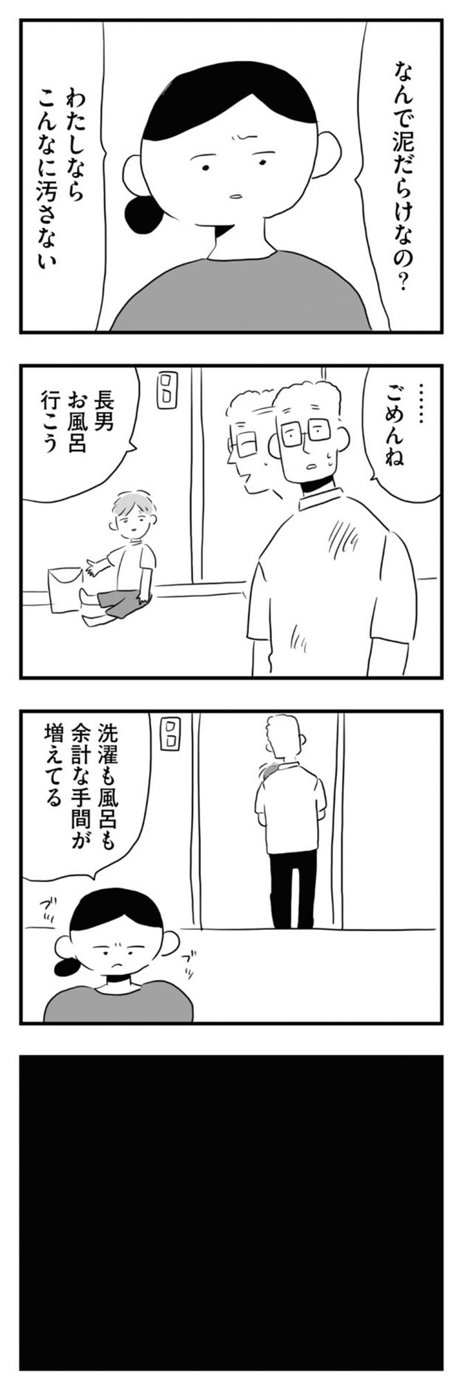 長男を公園に連れて行き、泥だらけで帰ってきた夫。その姿を見て、きつい嫌味を言ってしまう【夫にキレる私をとめられない #7】
