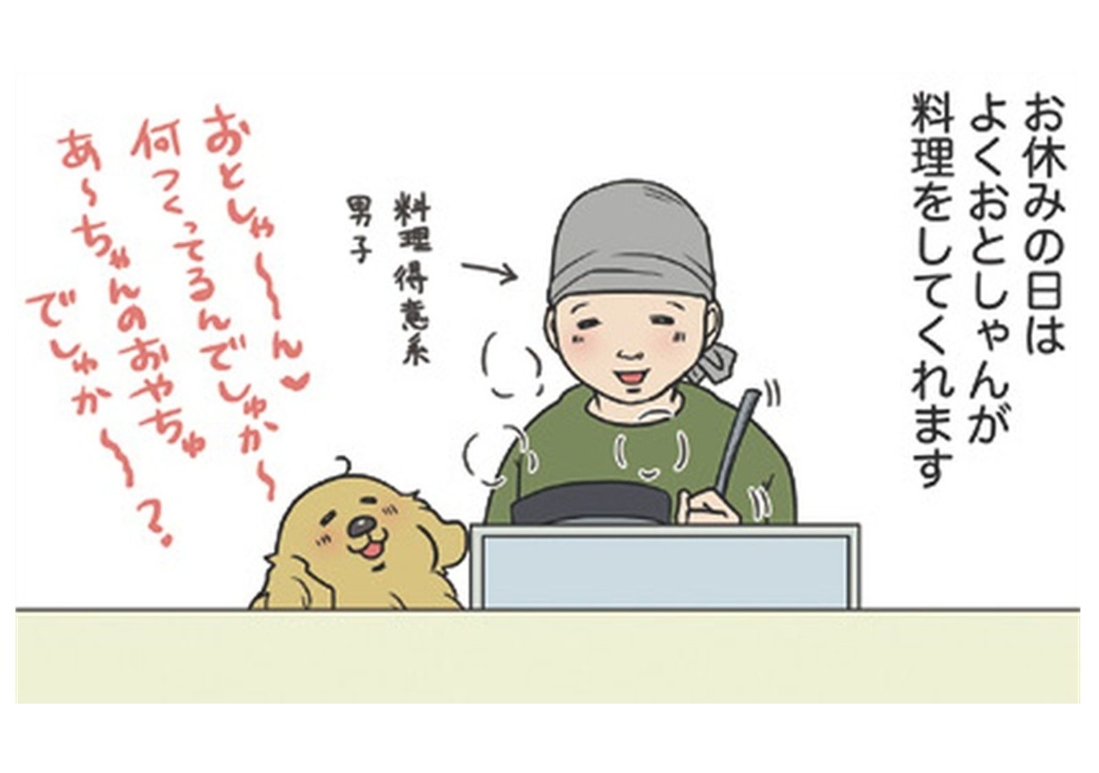 お父さんの料理を待ちながら席に着く…食事に参加する気満々の愛犬がかわいい♡【おさんぽですし! おしゃべり犬とイライラ猫の日記 #12】