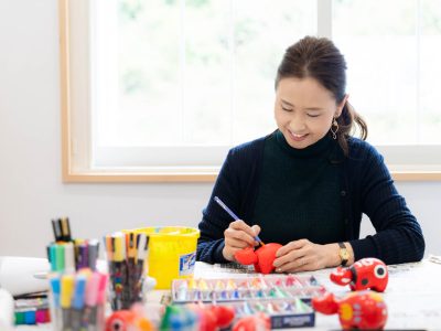 会津地方の郷土玩具「赤べこ」発祥の地が、柳津。2024年にリニューアルオープンした駅舎には、赤べこ工房が併設され、絵付け体験を楽しめる。「どんな模様にしようかな」と考えながら筆を動かす坪山良子さん。体験の所要時間は約60分。予約優先。