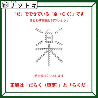 すると「だ」で「楽(らく)」を作っているわけなので「だらく(堕落)」という言葉が出てくるのではないでしょうか。