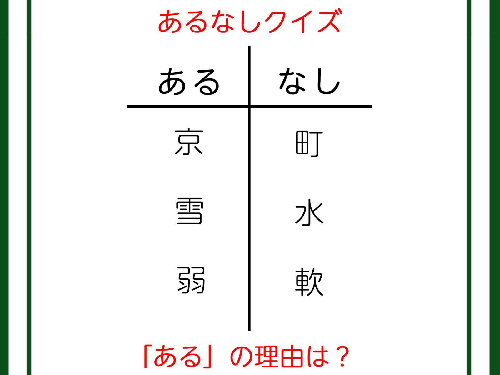 あるなしクイズです!「京にあって町にない、雪にあって水にない」あるの共通点は?【難易度LV3.・中辛】