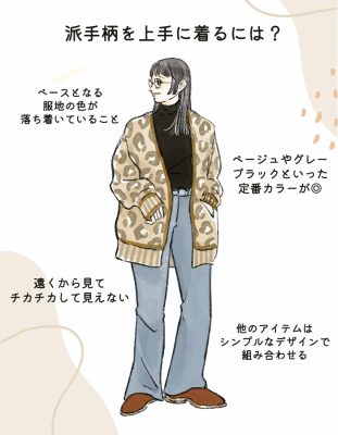 さりげなく取り入れて、おしゃれに見せるコツは、服の地の色が落ち着いているもの。遠目から見て目がチカチカしてみえないデザインのもの。配色に統一感がある着こなし。アクセントとなる柄は一つだけといったようにコーデ全体を通して引き算テクニックが入っているかどうかがポイントです。