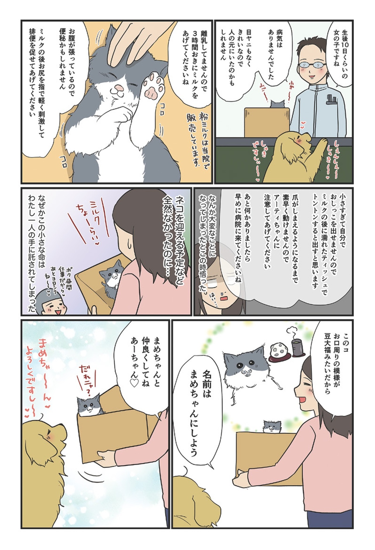 「ですし!」が口癖のゴールデンレトリーバー・アーティと、いつもイライラ怒ってばかりなのに家族思いなハチワレ猫・まめ。
