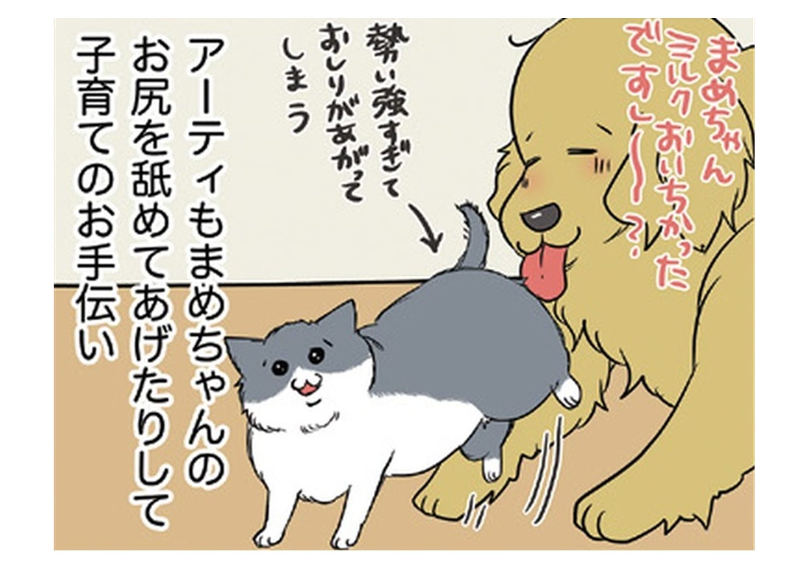 「ですし!」が口癖のゴールデンレトリーバー・アーティと、いつもイライラ怒ってばかりなのに家族思いなハチワレ猫・まめ。