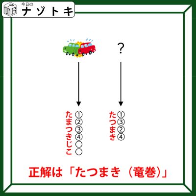 つまり、①が「た」、②が「ま」、③が「つ」、④が「き」ということになりますね。後は順番に右側の文字を読んでみましょう。正解は「たつまき(竜巻)」でした。