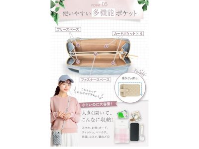 「ショルダー財布」としての機能も充実! ガバッと開いて中身が見やすい、横開きのポーチ。収納もいっぱいなのに140gなのは軽い~♪