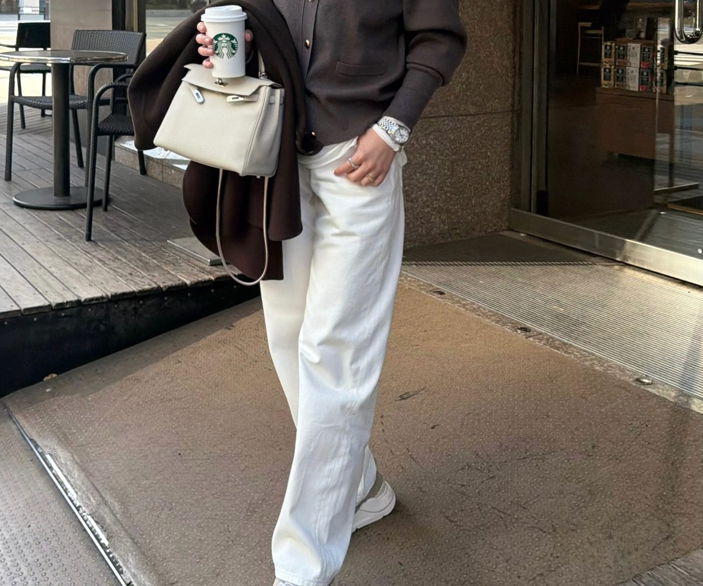 インナーにはウールのシアーロンTを仕込み、首元からわずかにのぞかせることで、着こなしに奥行きと今の気分をプラス。足元はベージュ系のスニーカーで軽やかにまとめ、バッグと色をリンクさせて統一感を出しているのがポイントです。メンズアイテムを取り入れながらも、手首の時計や上質なバッグで品を添えた、バランス感覚の光る装いです。