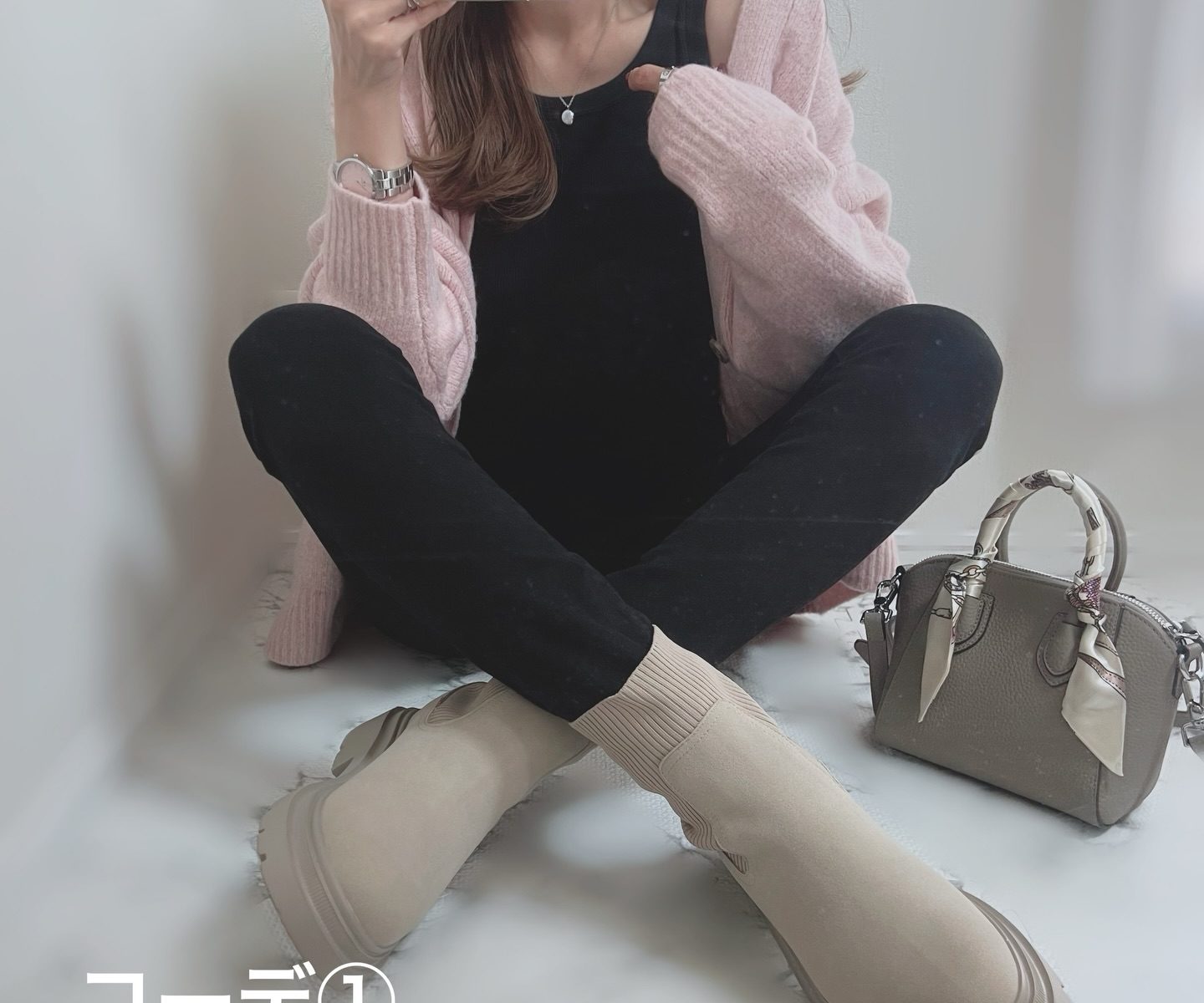 足元にはトレンドのボリュームソールブーツを選び、ベージュを差し色にすることで全体を柔らかなトーンで中和しています。バッグにはスカーフを巻いてアクセントを加え、ラフな中にも品を添えているのがポイントです。少しずつ暖かくなるこれからの季節、軽やかなニットを主役にした大人の着こなしが気分。