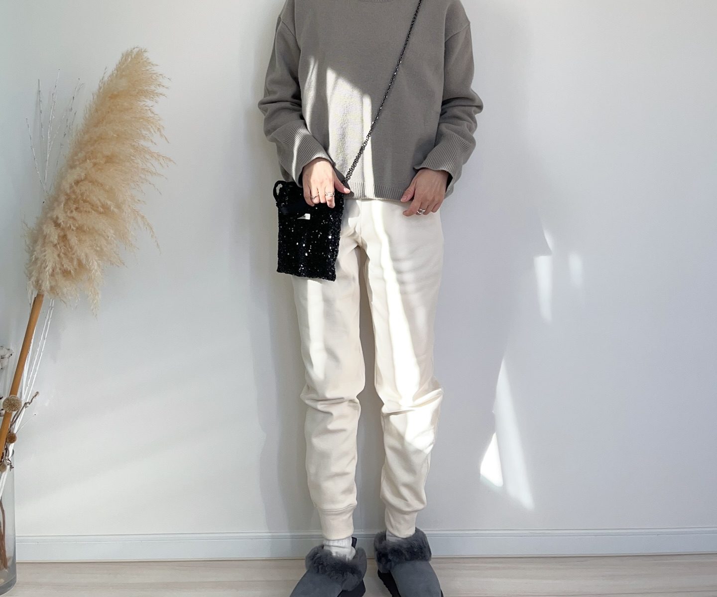斜め掛けしたスパンコールバッグがキラリと光り、単調になりがちな装いに華やぎを添えてくれます。楽ちんなのに手抜きに見えない、大人の余裕を感じさせる絶妙なバランスです。