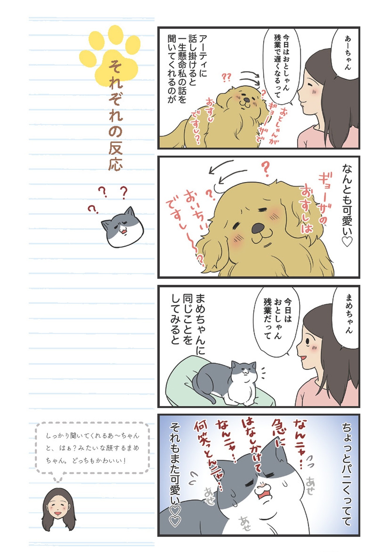 話しかけると一生懸命、聞いてくれる愛犬の仕草が可愛い♡ 一方、愛猫の反応は…?!【おさんぽですし! おしゃべり犬とイライラ猫の日記 #28】