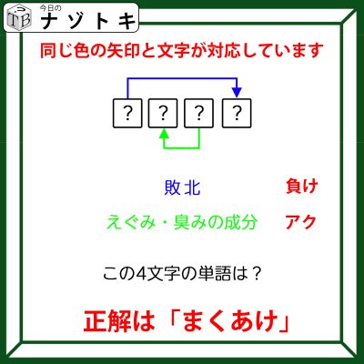 青文字の「敗北」は「まけ」、そして緑文字の「えぐみ・臭みの成分」は「あく」でした。「あく」は少しだけ難しかったかもしれませんね。