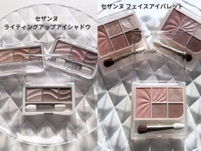 セザンヌのアイシャドウはほぼ全種試しましたが、特に出番が多く、全色そろえているのが次の2つ。「セザンヌ ライティングアップアイシャドウ」(税込693円)と「セザンヌ フェイスアイパレット」(税込847円)です。