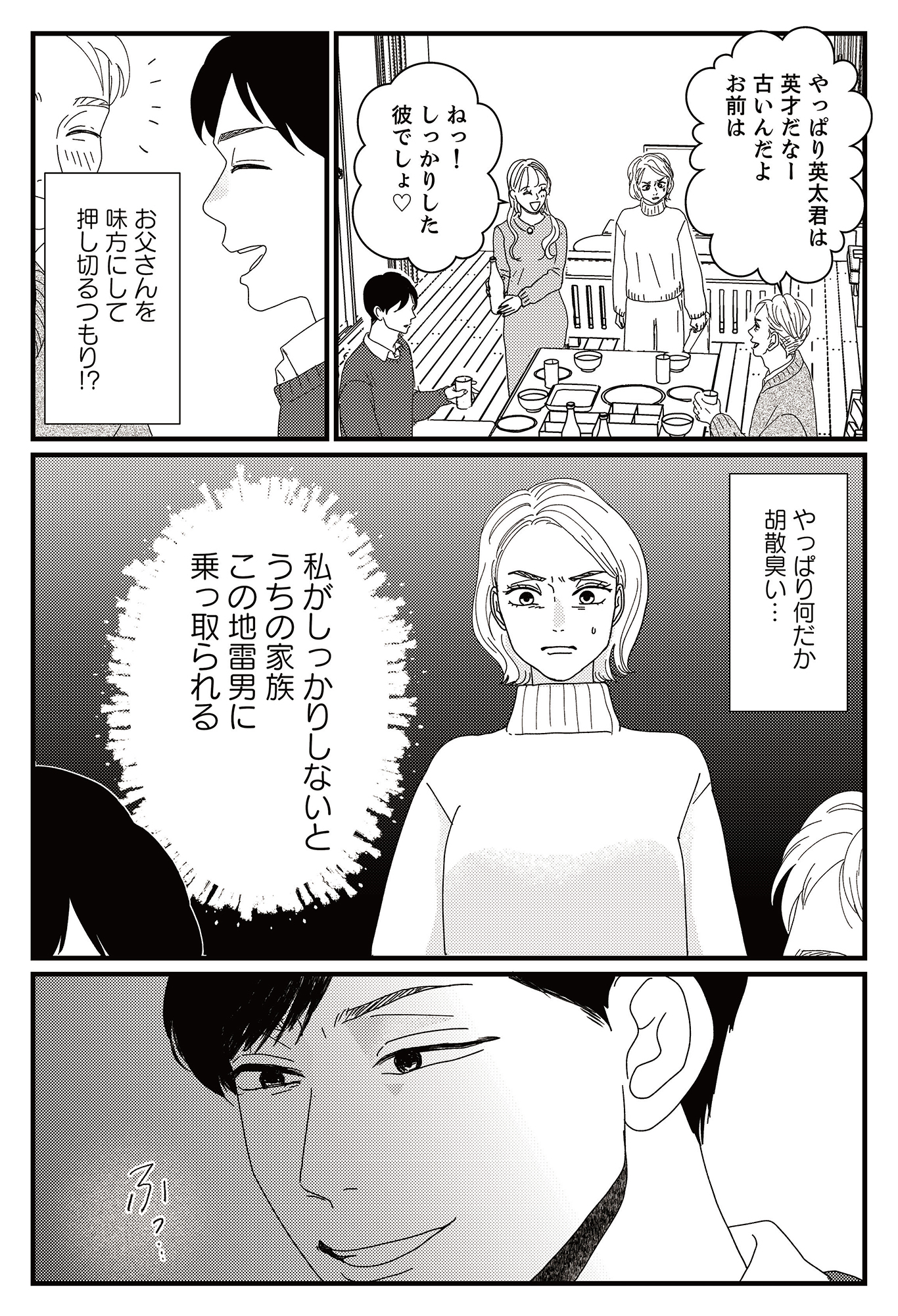 結婚挨拶をするために家にやってきた地雷男。夫はすぐに彼を気に入るが、胡散臭さ満載!【地雷男にサヨナラ #4】
