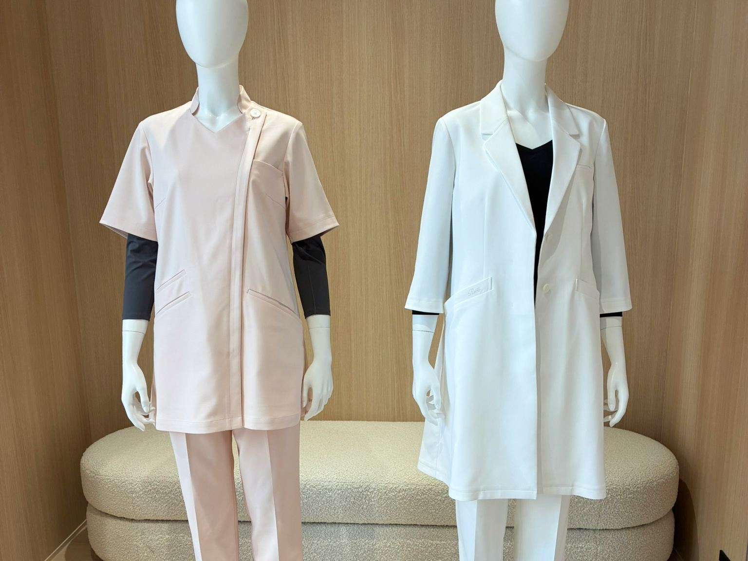 左・ReFa VITALTECH スクラブ トップス 17,600円、パンツ 15,400円、 インナー 13,200円 右・ドクターズコート 38,500円