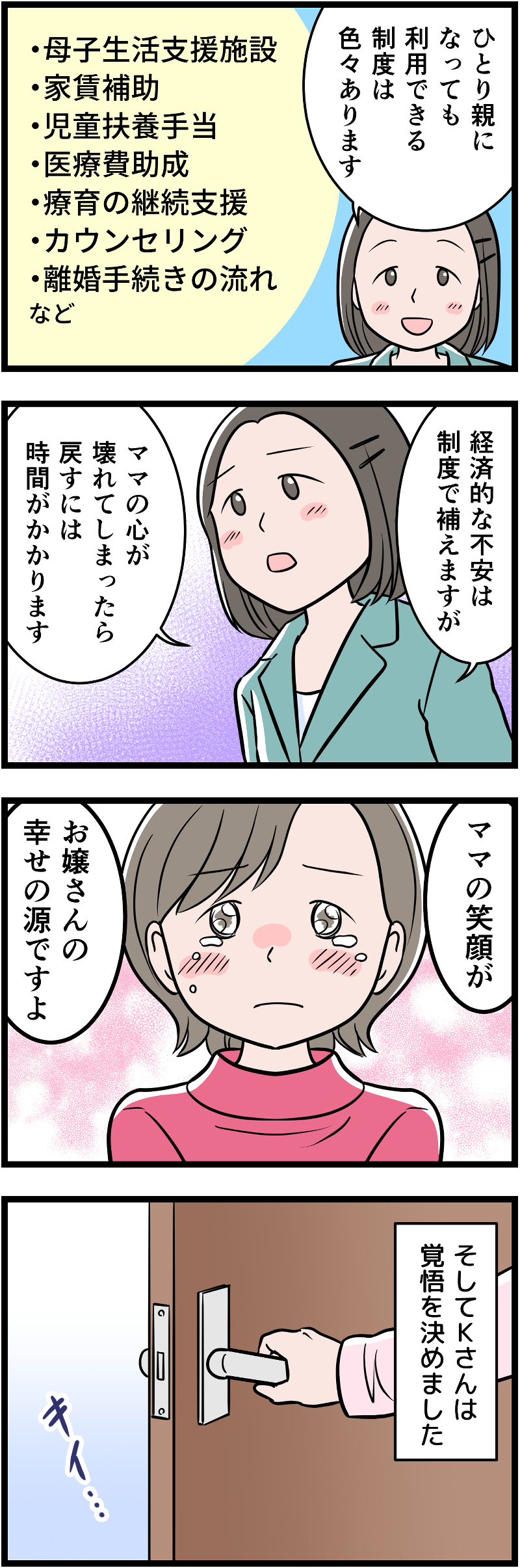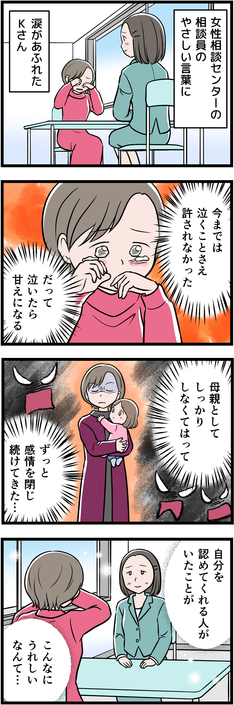 激怒した夫から娘ごとボコボコに殴られたKさんが最初に行った場所、それは「女性相談センター」でした。そこでアドバイスを受けて、家に帰りますが…