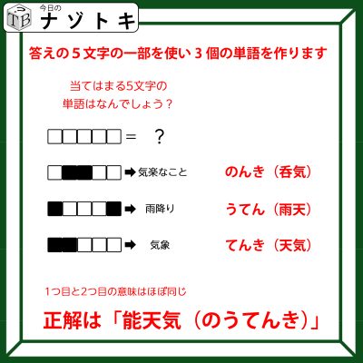 3つの単語の答えは上から「のんき」「うてん(雨天)」「てんき」です。そして正解は「のんき」とほぼ同じ答えになるそうです。