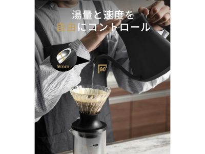 38~100℃の間で「1℃単位の温度設定」が可能! 注ぐ量や速度のコントロールをしやすい注ぎ口のデザイン。こだわりのドリップコーヒーを味わいたい方に