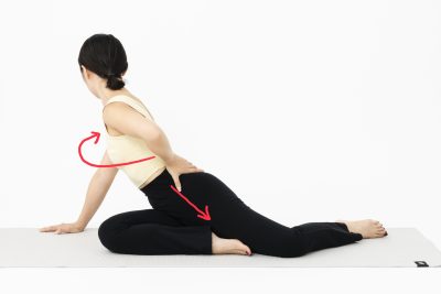 鼠径部を伸ばしながら、ひねりを加えるストレッチです。硬くなった腰回りもほぐれて一石二鳥!
