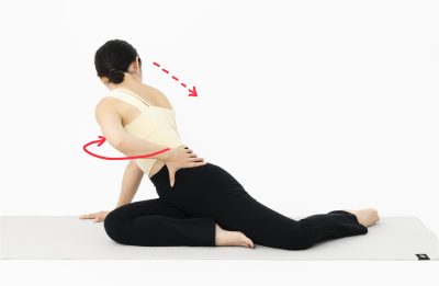 さらに腰をひねり、鼠径部を伸ばす。曲げている足に体重を預けてOK。可能なら、左足のつま先が見えるまでひねって。硬くて痛みがある人は、できる範囲で無理をしないように。