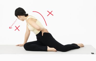 お尻をペタンと床につけ、視線が下がると背中も丸まってしまいます。伸ばしたい鼠径部もしっかりと伸びないので、視線も背中も真っ直ぐを意識して。