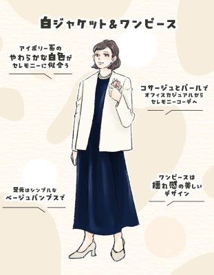 白ジャケット+紺色ワンピースでセレモニー感を